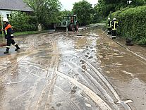 Zur Unterstützung wurde ein Traktor der Gemeinde mit Schaufel bereitgestellt. Dadurch konnten bereits die oberste "Dreckschicht" von der Straße entfernt werden.